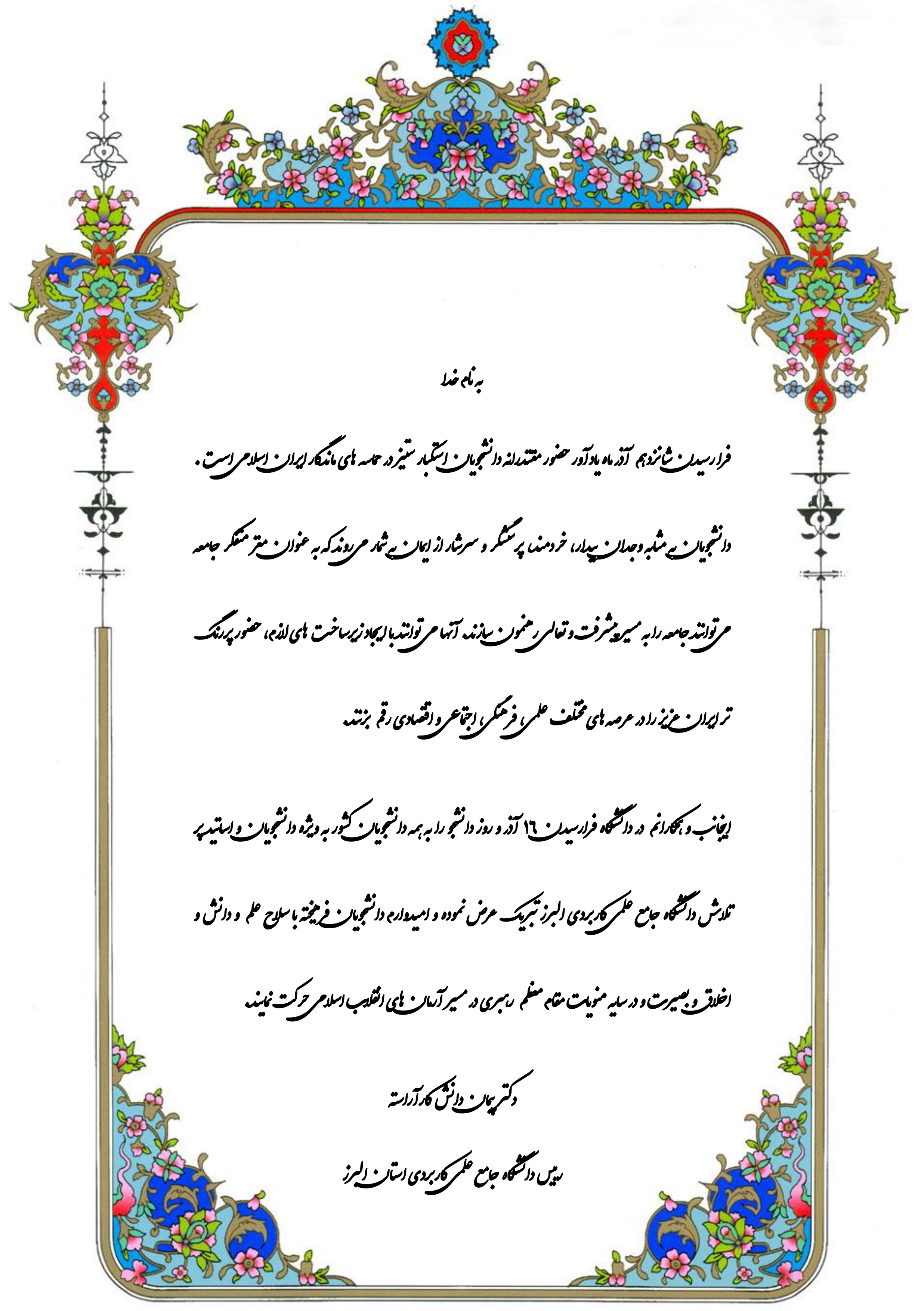 پیام تبریک رییس دانشگاه جامع علمی کاربردی البرز به مناسبت "روز دانشجو"